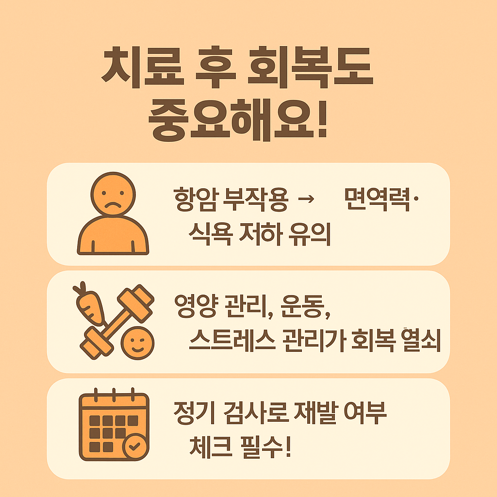 - 정기 진료 및 혈액검사: 3~6개월 간격으로 종양표지자 확인