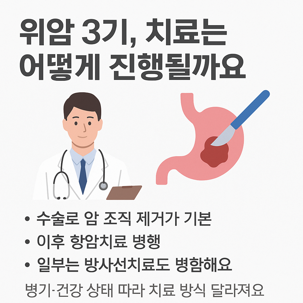 위암 3기의 치료는 단일 방식으로는 효과가 부족하며, 수술, 항암치료, 방사선치료를 병합한 다학제 치료 전략이 적용됩니다. 병기의 세부 단계(3A~3C)와 환자의 건강 상태에 따라 치료 순서와 조합이 달라질 수 있으며, 최근에는 면역치료나 표적치료도 일부 환자에게 적용되고 있습니다.