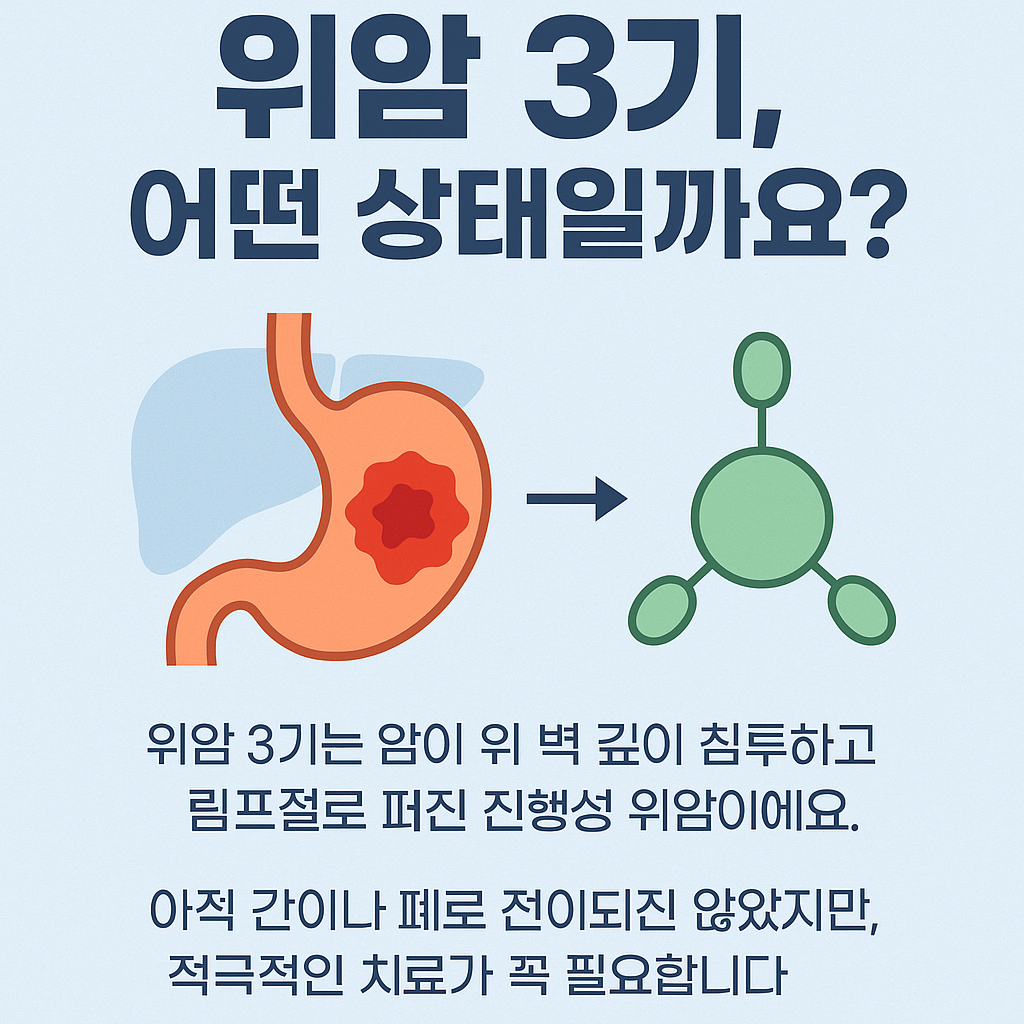- 위암 3기는 종양이 깊이 침범하고 림프절 전이가 진행된 상태