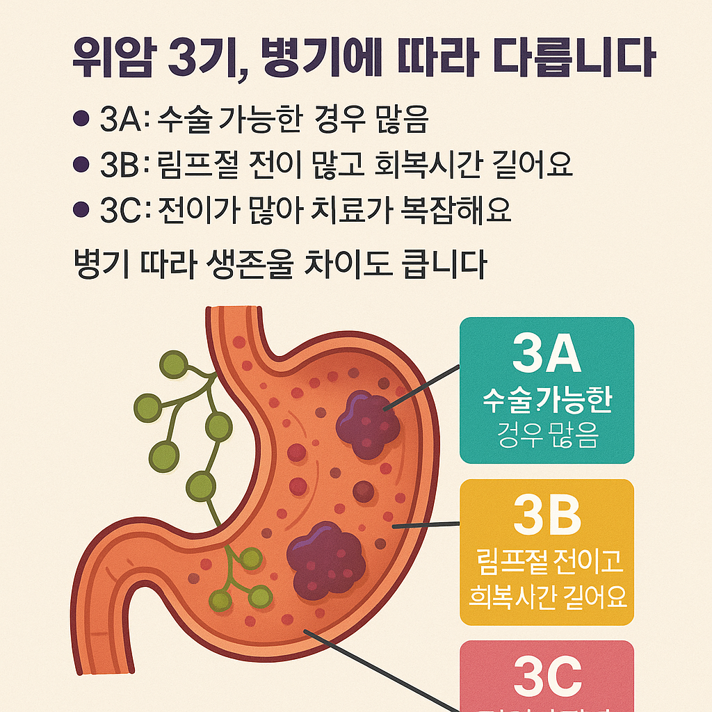 | 3A기 | 위 근육층 침범 + 림프절 소수 전이 | 절제 가능한 경우가 많고, 항암 병행 시 생존율 향상 기대 |