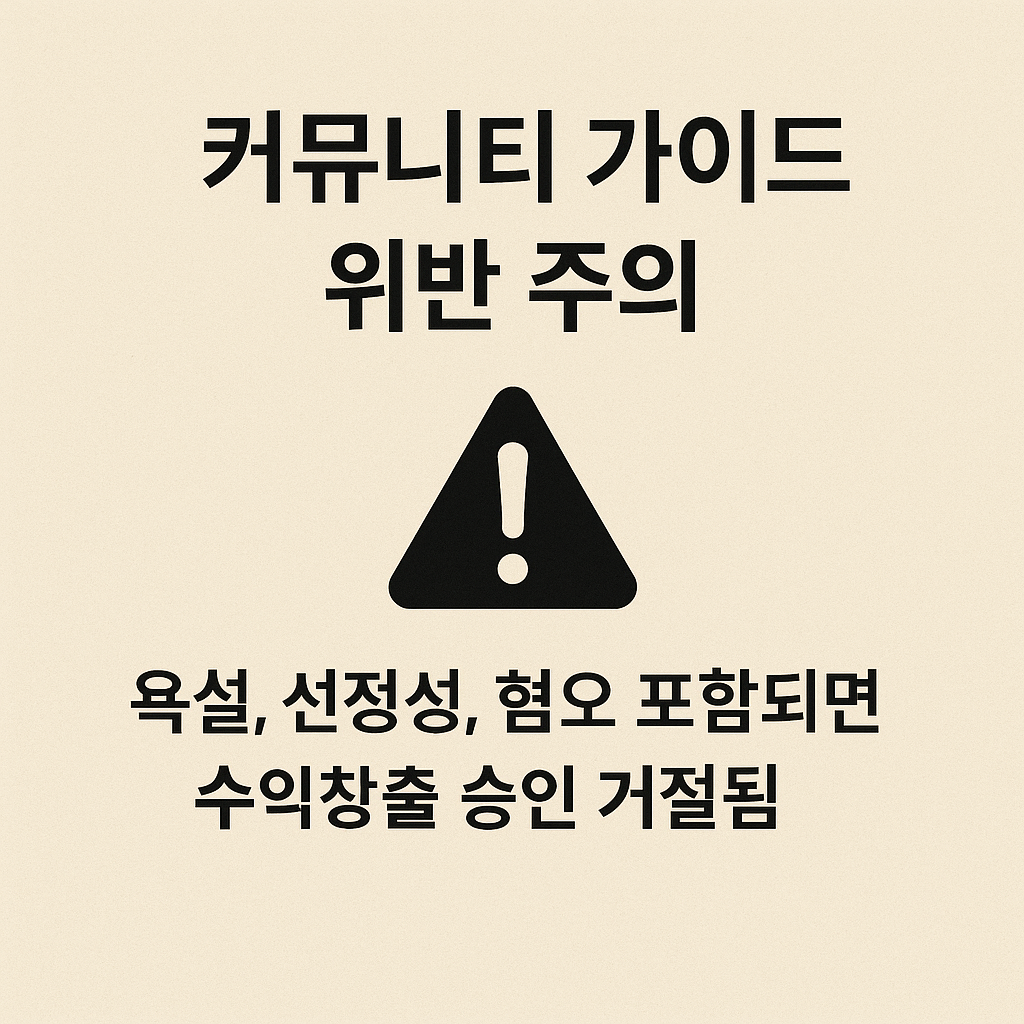 | 정책 준수 | 커뮤니티 가이드라인, 저작권, 스팸 정책 위반 시 수익 정지 가능 |