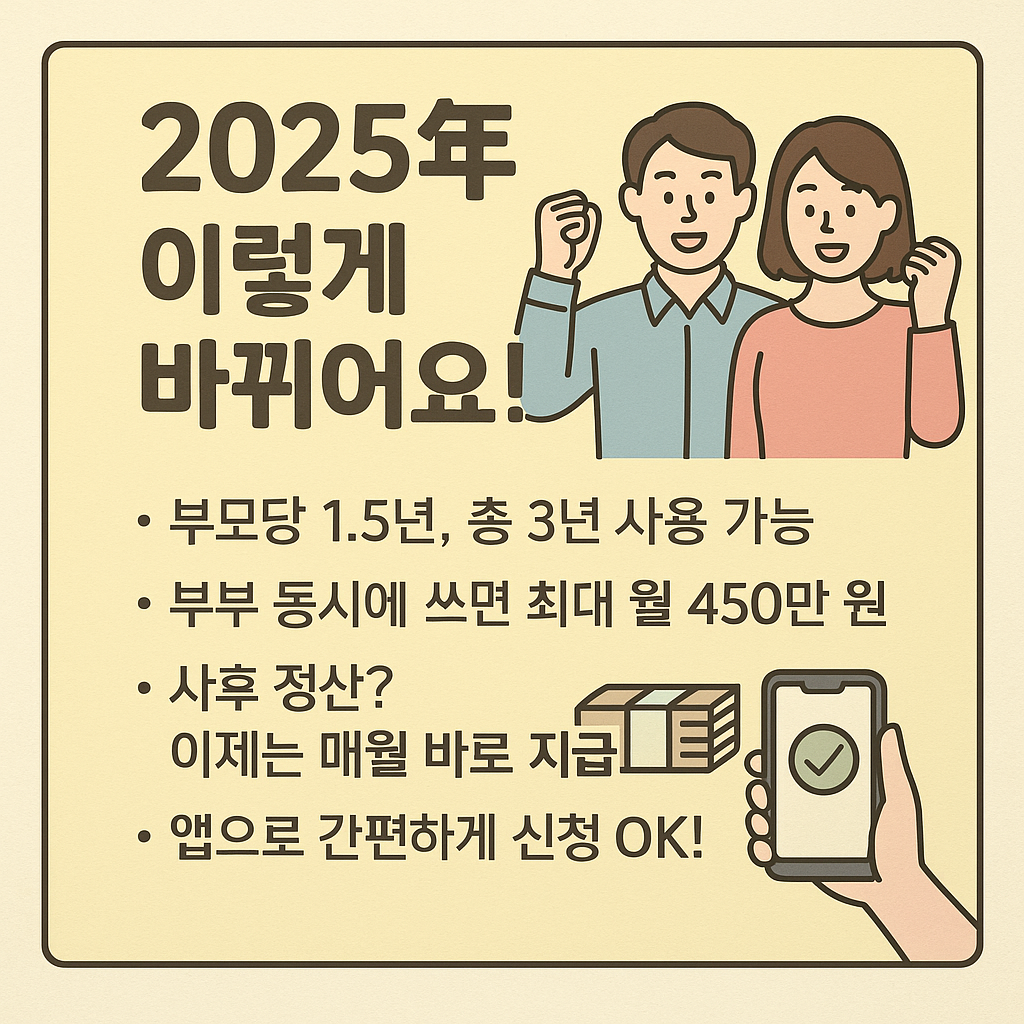 2025년부터는 사후 정산 방식이 폐지되어, 급여 전액이 매월 실시간으로 지급됩니다. 이전에는 일부 금액(25%)을 육아휴직 종료 후 일괄 지급했지만, 현재는 모두 월별로 지급되며 별도 정산 절차가 필요 없습니다.