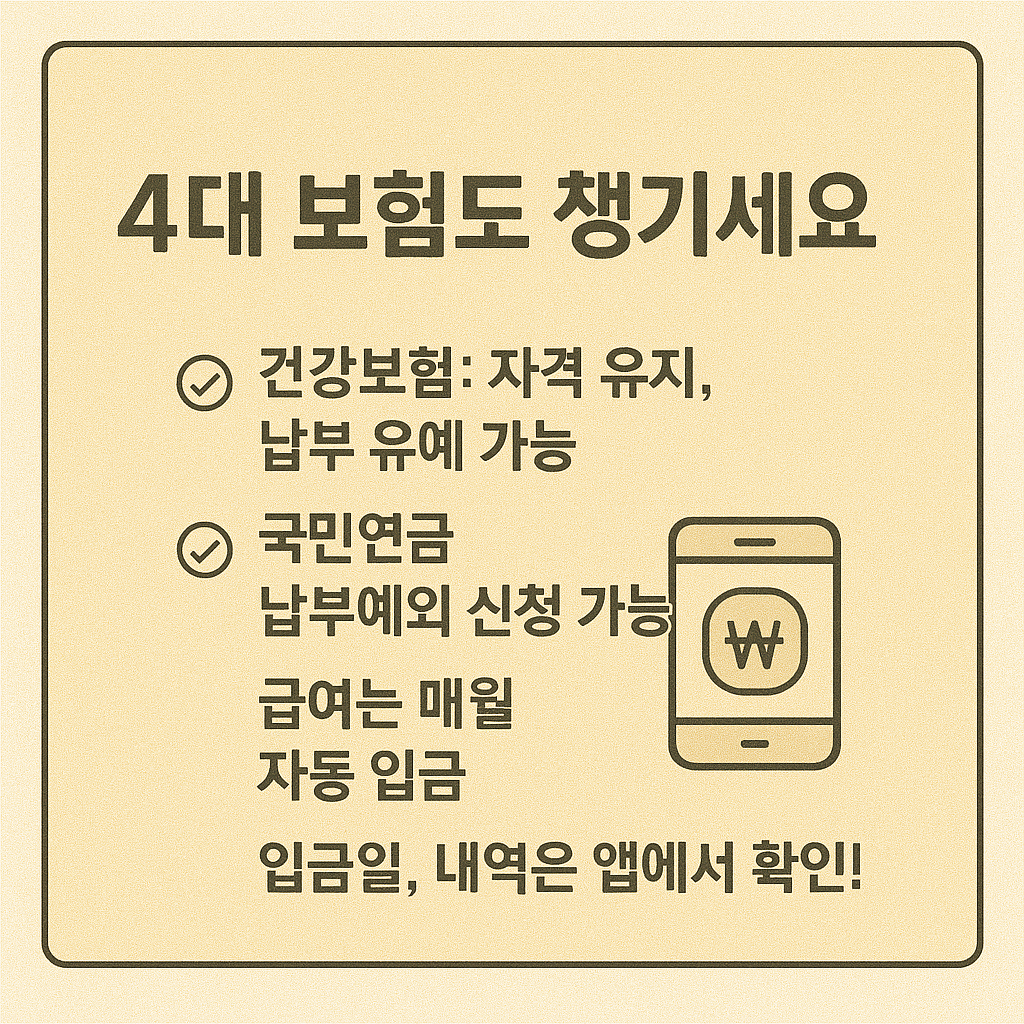 | 건강보험 | 자격 유지, 보험료 일부 또는 전액 유예 가능 | 직장가입자 신분 유지 필요 |