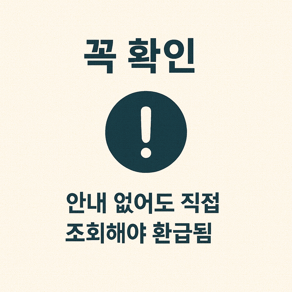 공단은 환급 대상자에게 문자나 우편으로 안내를 보내고 있지만, 주소 불일치, 연락처 미등록, 통신 수신 차단 등의 이유로 안내를 받지 못하는 경우도 많습니다. 안내를 받지 못하더라도 본인이 대상자가 아닐 것이라고 단정하지 말고, 반드시 직접 조회해야 합니다.