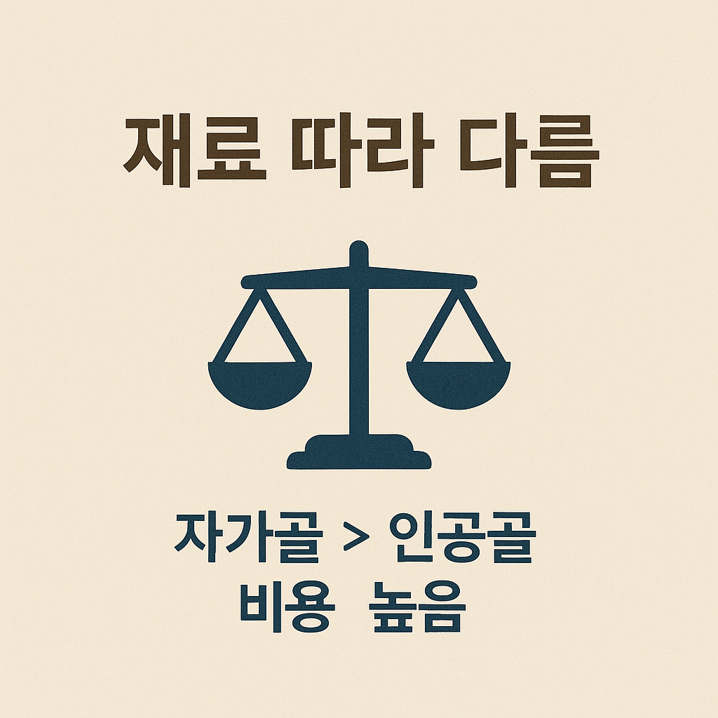 | 이종골 | 동물 유래, 생체적합성 높음 | 중간 결손 부위, 비용 고려 시 |