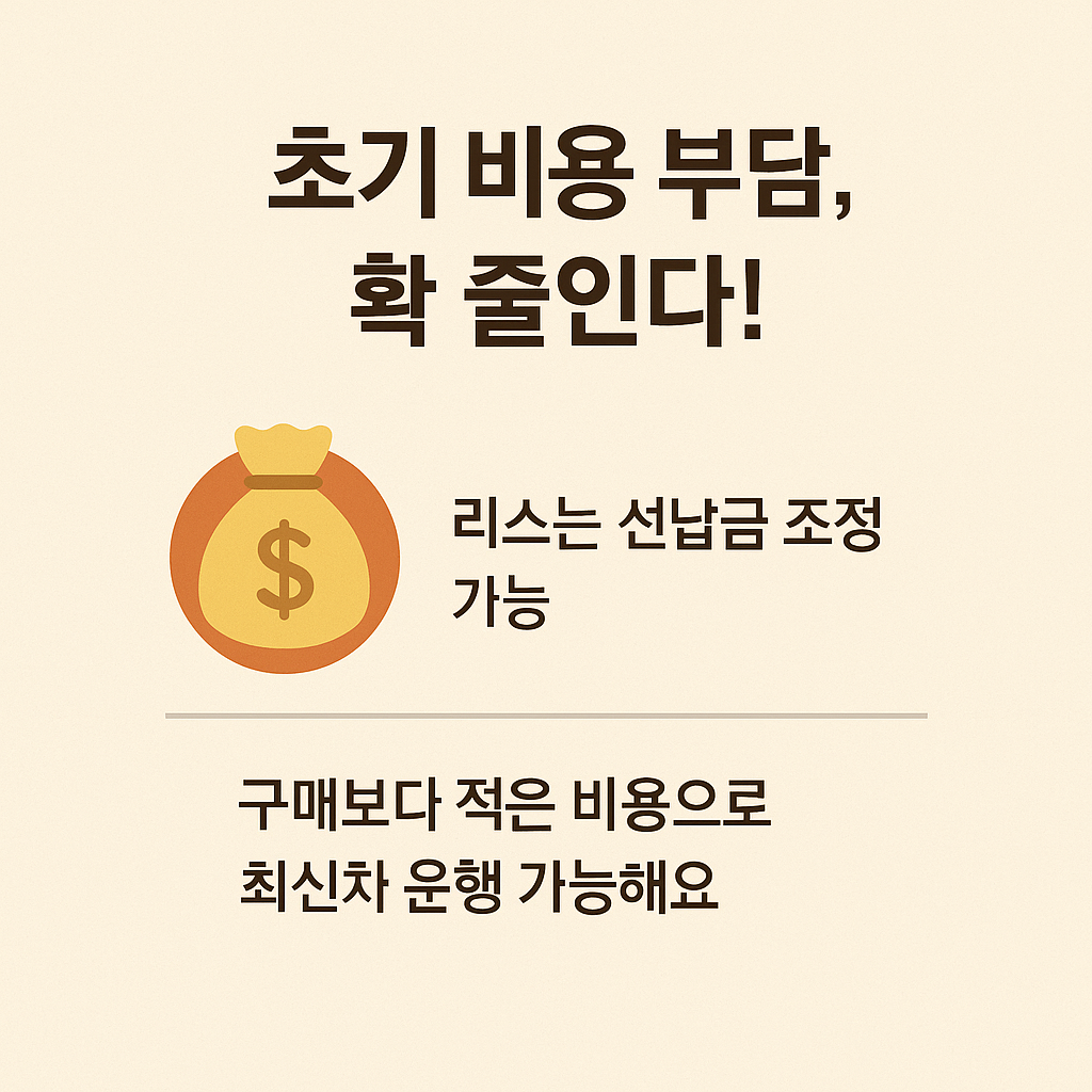 - 자동차 리스는 초기 비용 부담이 적고, 차량의 실질 소유 없이 일정 기간 사용이 가능하여 운영비 절감에 유리합니다.