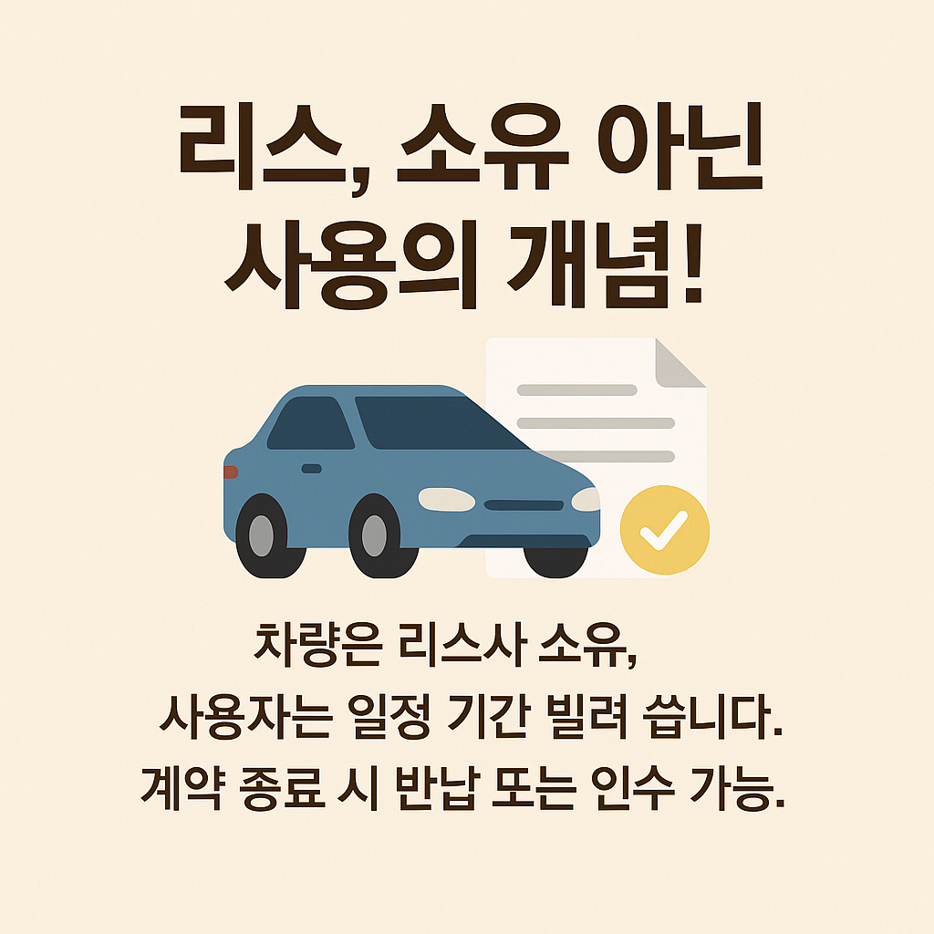 - 리스는 차량을 일정 기간 빌려 사용하는 것이며, 계약 종료 시 인수하거나 반납하는 구조입니다. 보험과 정비, 세금은 사용자가 직접 처리해야 합니다.
