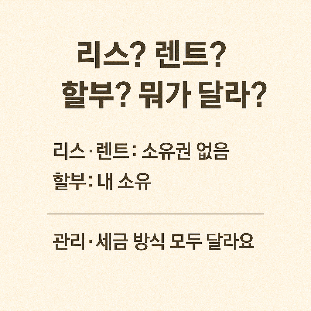 - 각 방식은 소유권의 귀속 여부, 보험 처리 방식, 세금 납부 주체, 중도 해지 가능 여부, 적합 대상 등의 측면에서 차이가 있습니다.