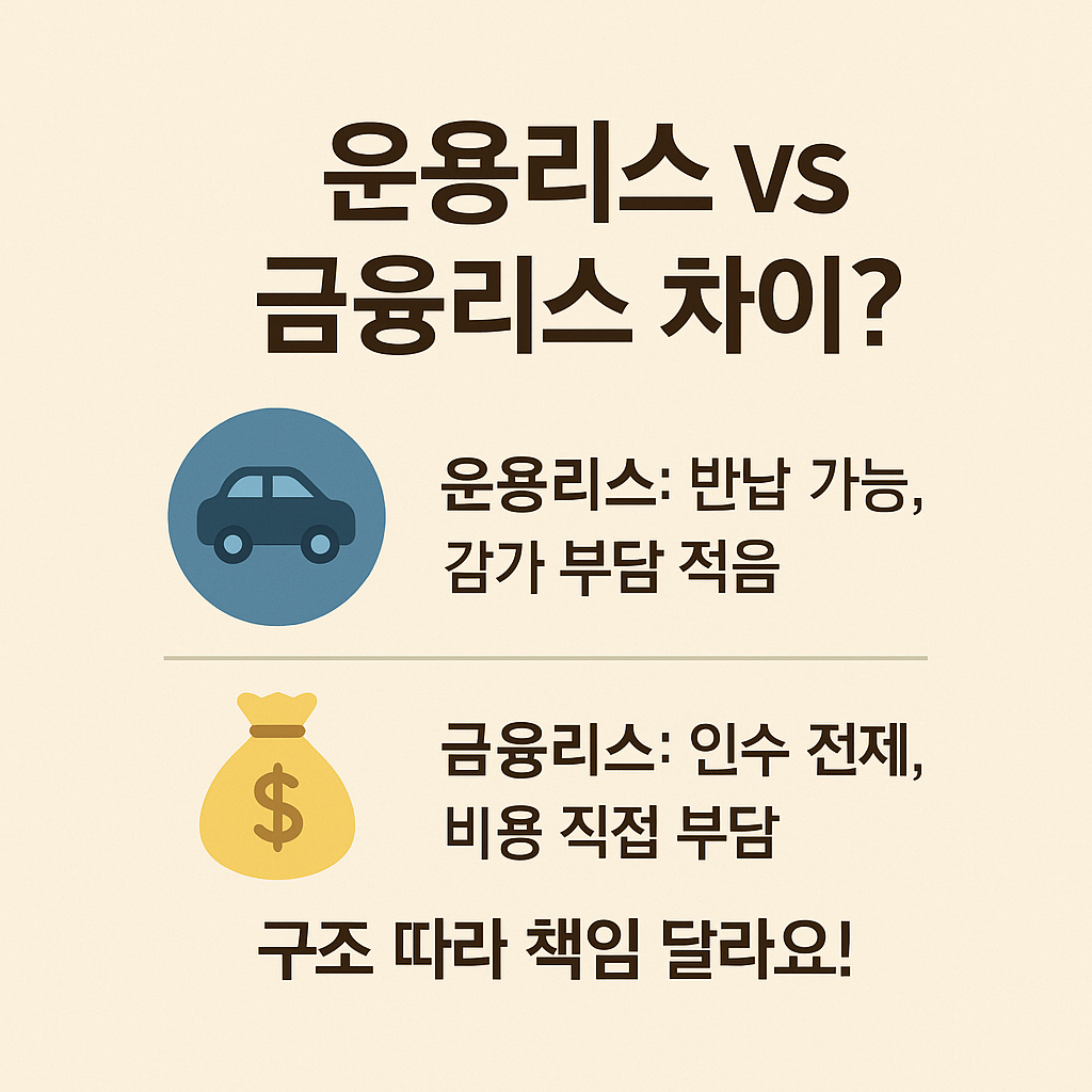 - 반면 금융리스는 실질적으로 차량을 구매하는 것과 유사하게 계약되어, 만기 시 인수가 전제되는 구조가 많습니다.