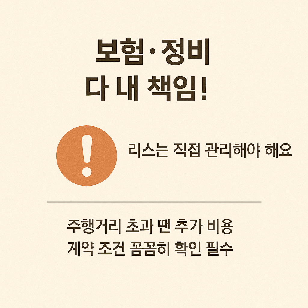 | 관리 책임 | 보험·세금·정비 모두 사용자 부담 | 정비 이력 및 비용 체크 필수 |