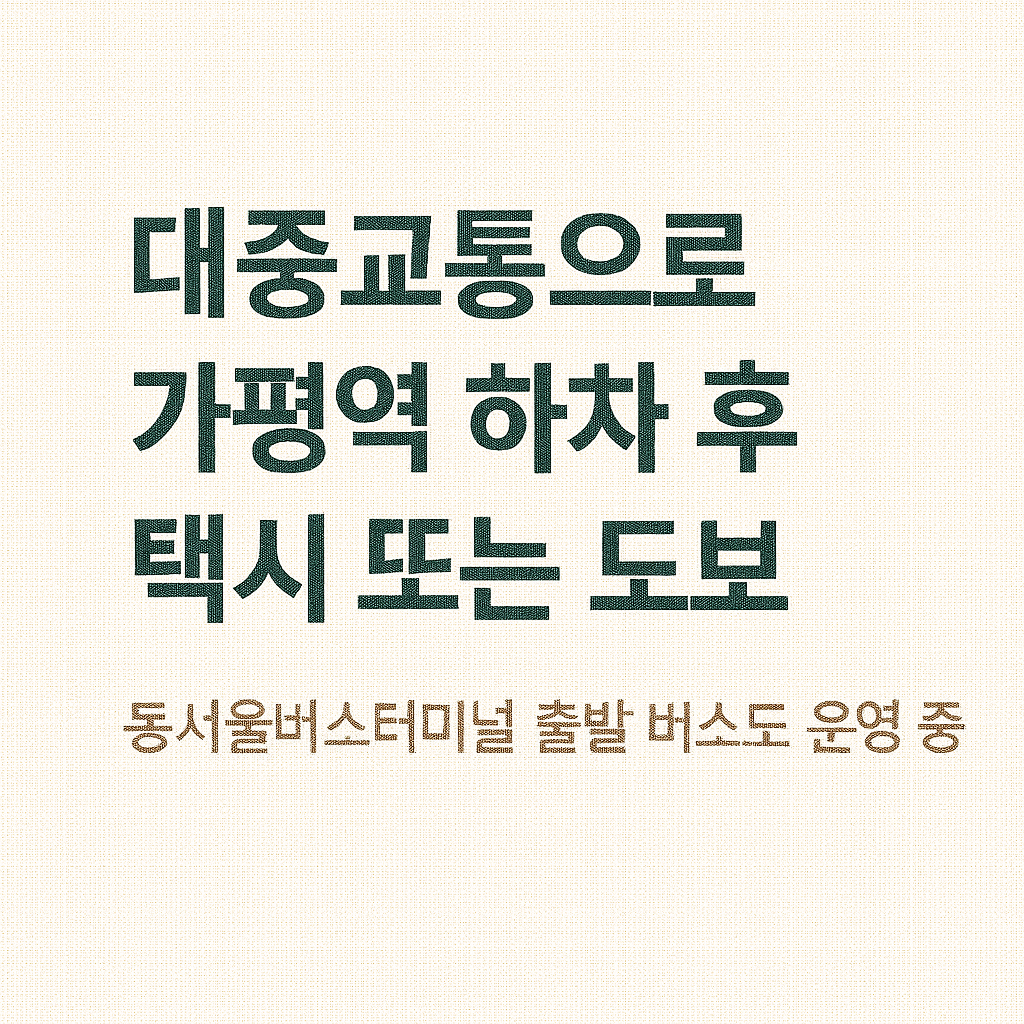 - 버스: 동서울버스터미널에서 출발하는 가평행 버스를 이용하세요. 첫차는 오전 6시 45분, 막차는 오후 8시 50분이며, 일반요금은 약 8,000원입니다.
