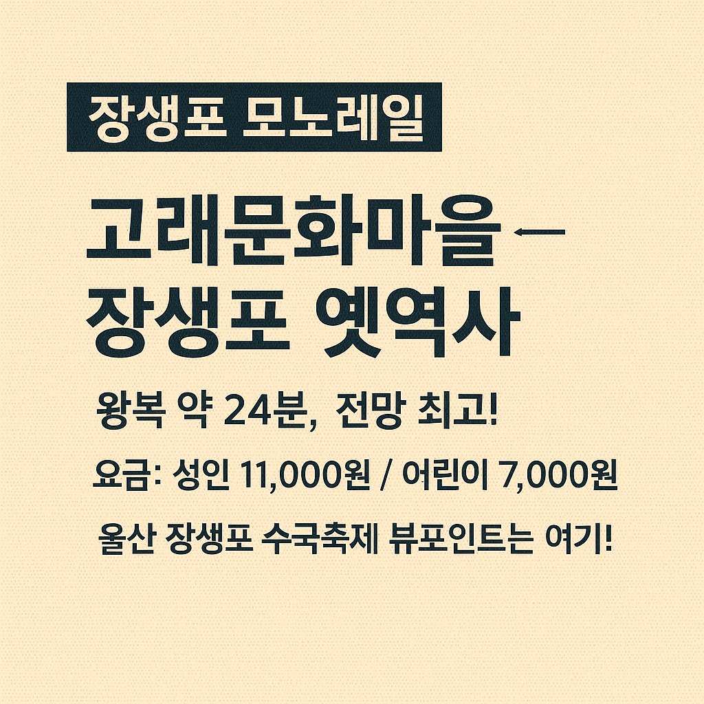 장생포 모노레일은 울산 남구 장생포 고래문화특구의 대표 교통 체험 콘텐츠로, 고래박물관에서 장생포 옛역사까지 약 1.3km 구간을 왕복 운행합니다. 축제장 주요 지점을 연결하며 전망 포인트를 지나기 때문에, 이동 수단을 넘어선 명소로 자리잡고 있습니다.