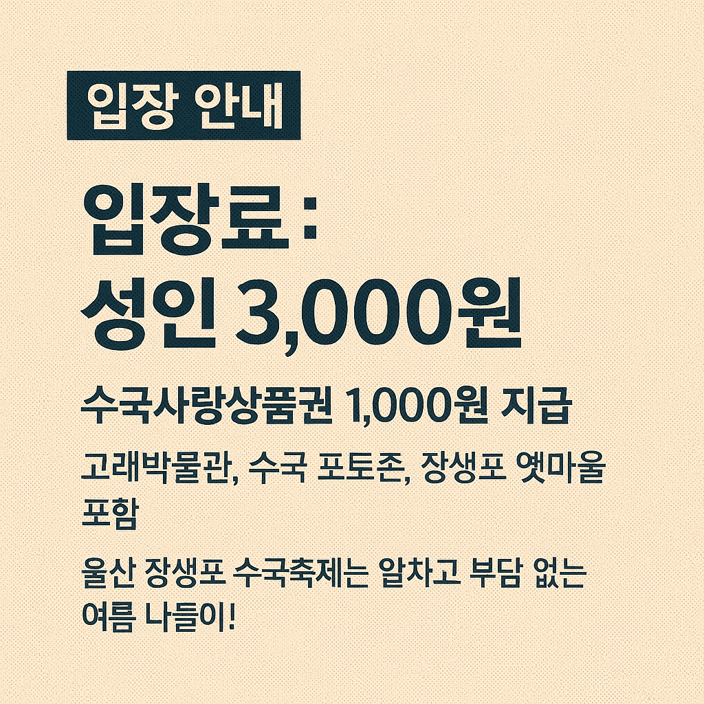 주차장마다 요금 정책이 상이하며, 일부 장소에서는 고래문화마을 입장권 소지 시 일정 시간 무료 주차 혜택이 제공되기도 합니다. 축제 기간에는 주말 기준 조기 만차가 예상되므로 이른 방문 또는 대중교통 이용이 권장됩니다.