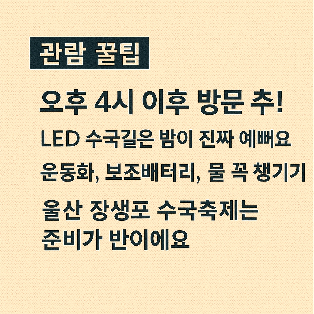 - 3. 장생포 옛마을 뒤편 임시 주차장: 일부 구간 무료 개방 여부는 행사 전 공지 확인 필요