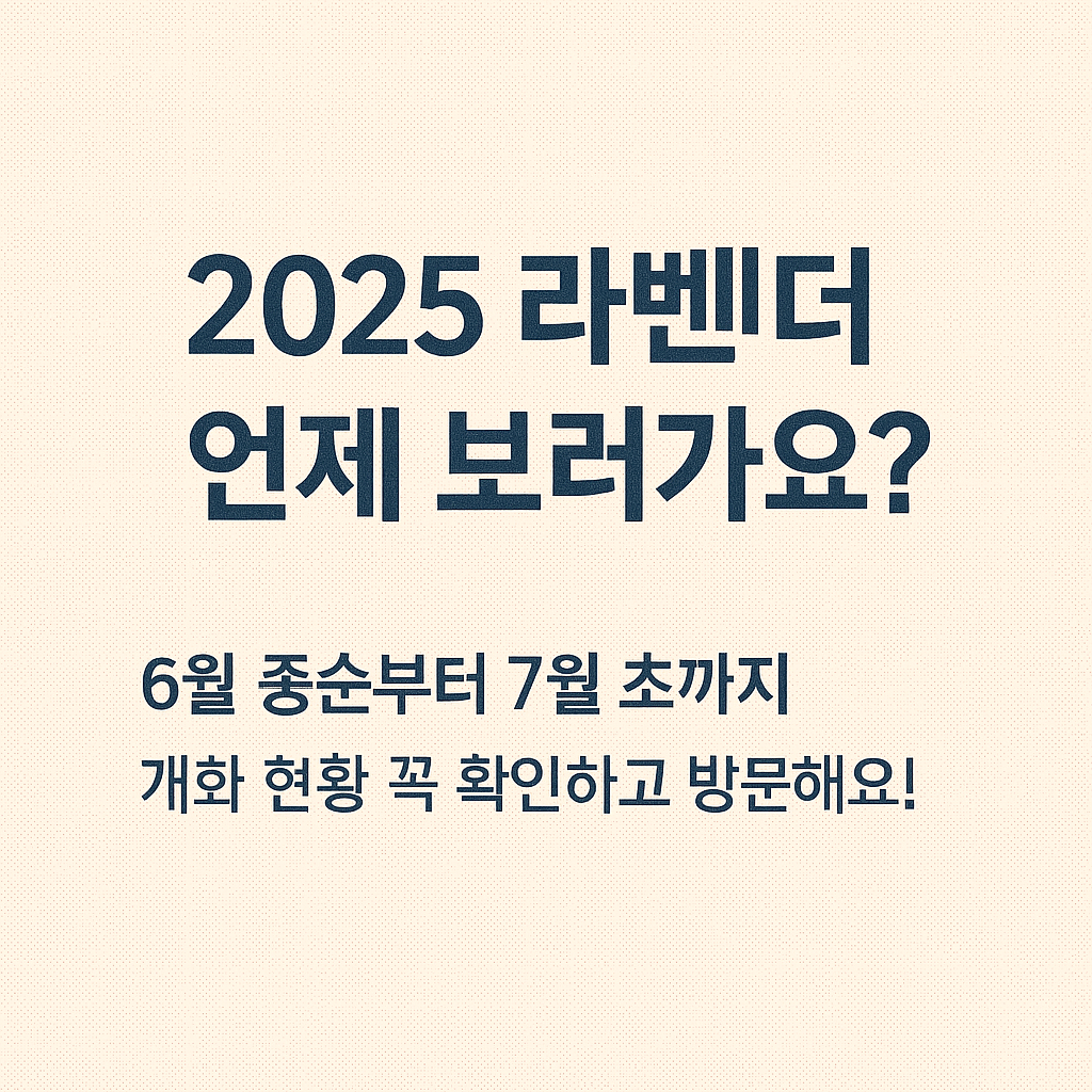 2024년 기준으로는 6월 1일부터 6월 30일까지 한 달간 라벤더 개화 시기에 맞춰 축제가 운영되었으며, 전체 라벤더 군락지의 절정 시기는 대체로 6월 셋째 주~넷째 주 사이였습니다. 하지만 2025년에는 6월 초 현재 개화율이 10% 미만이라는 점을 고려할 때, 절정 시기는 다소 늦춰질 가능성도 있습니다.
