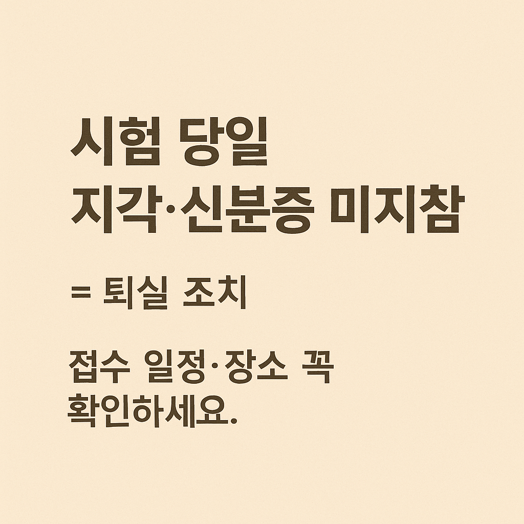 시험 접수 완료 후 수험자 본인의 부주의로 인한 응시 불가(날짜 착오, 장소 착오, 신분증 미지참 등)는 전적으로 수험자 책임이며, 이로 인한 재응시는 인정되지 않습니다. 특히 CBT 필기시험은 입실 마감 시간이 엄격하게 적용되므로, 시험 시작 시간 30분 전에 도착하는 것이 안전합니다.