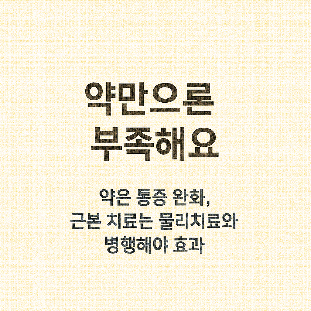 주의할 점은 약물은 통증을 "없애는" 것이 아니라 "줄여주는" 역할을 하며, 치료 효과를 높이기 위한 보조 수단이라는 점입니다. 단순 약물 의존은 장기적으로 재발률을 높이는 원인이 될 수 있습니다.