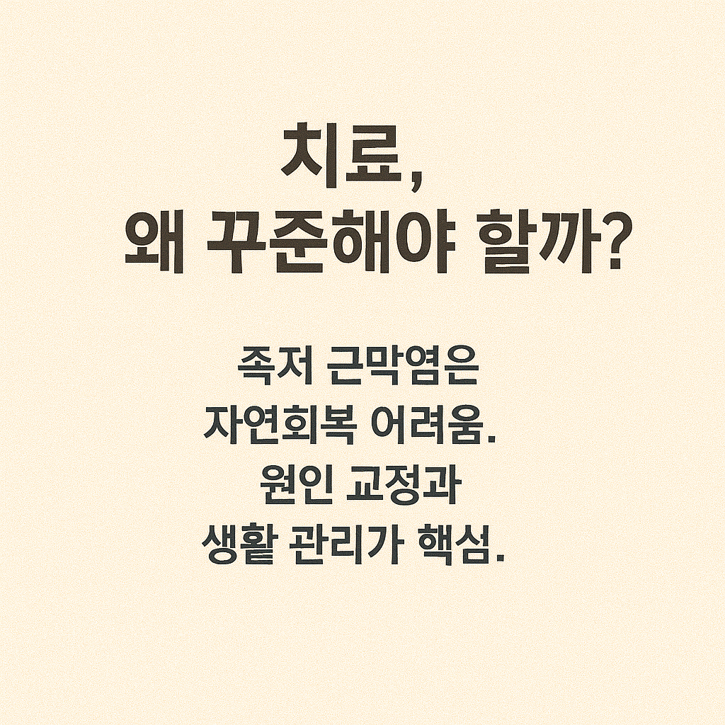 이처럼 족저 근막염 치료방법은 증상의 정도, 지속 시간, 생활 습관에 따라 다르게 적용되어야 하며, 그 어떤 치료법도 “한 번에 끝나는 완치”는 기대하기 어렵습니다. “통증이 사라졌다고 끝이 아니다”는 원칙을 항상 기억해야 합니다.