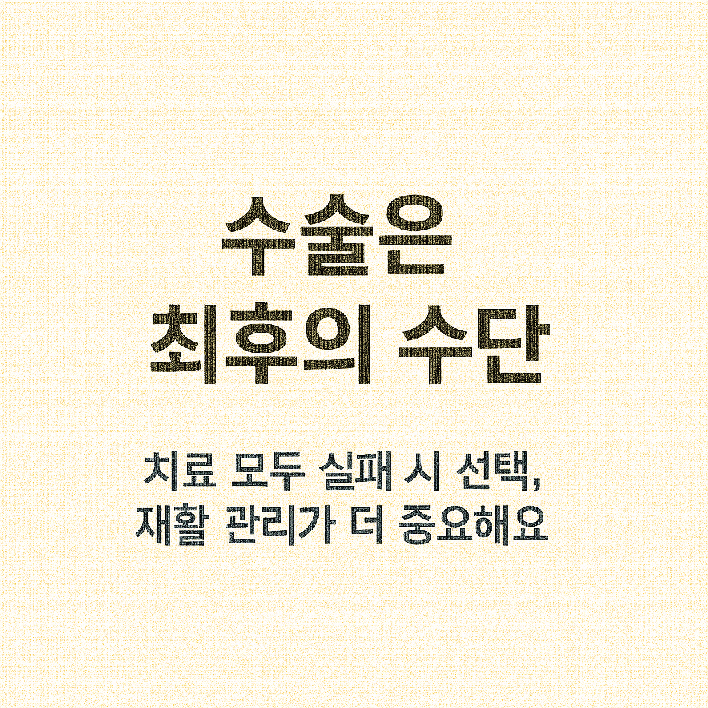 - 수술: 6개월 이상 치료 실패 시 고려, 회복기간 최소 6주