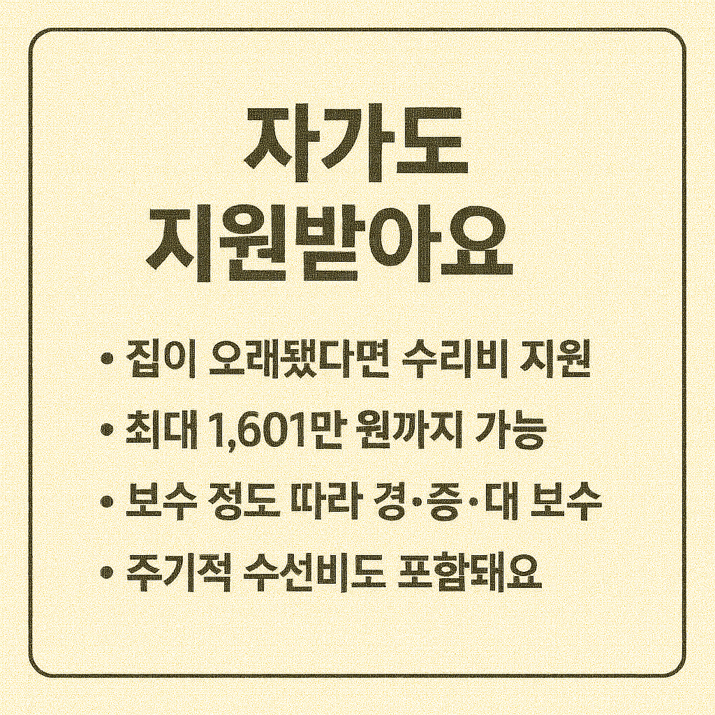 - 자가가구: 주택 노후 상태에 따라 일정 금액의 수선비용을 정기적으로 지원