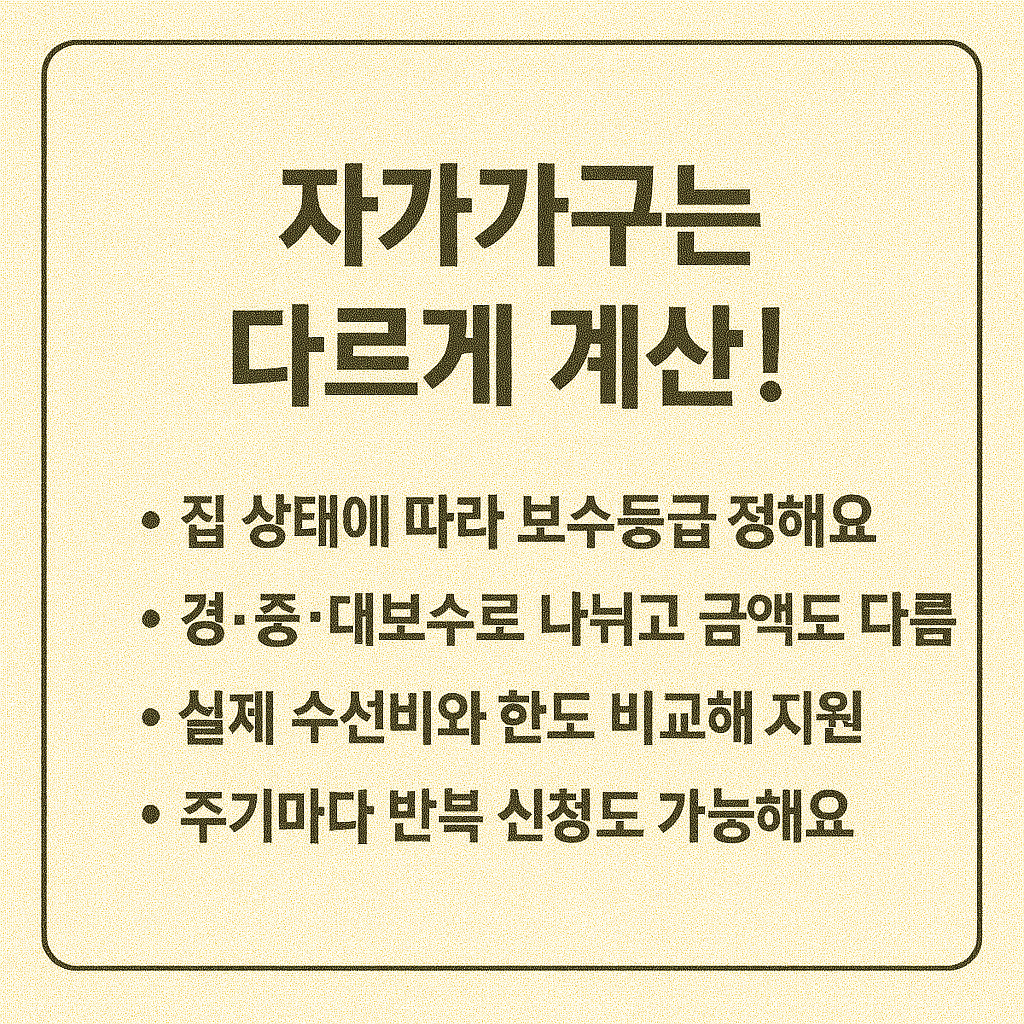- ③ 자가가구 자기 부담금은 별도 없으며, 실제 수선비용이 상한선 이하이면 전액 지원