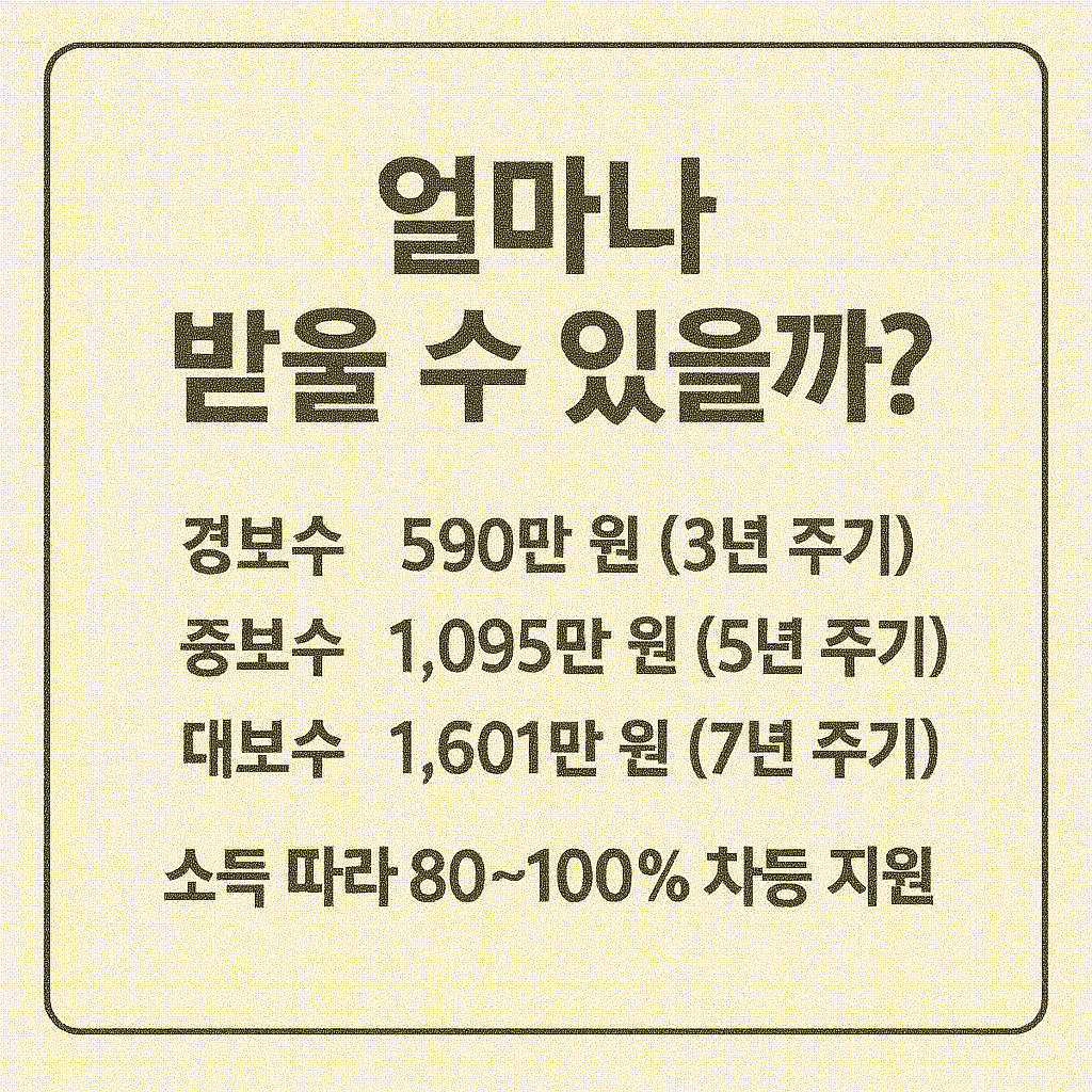 경보수 예시 — 가구 소득인정액이 생계급여 수준이면 590만원 전액을 지원받습니다. 만약 자가 보수가 필요한 비용이 400만 원이면, 400만원 전액을 받을 수 있습니다. 반면, 실제 수선비용이 700만 원이라면 상한선인 590만 원만 지급되므로 그 이상은 본인이 부담해야 합니다.