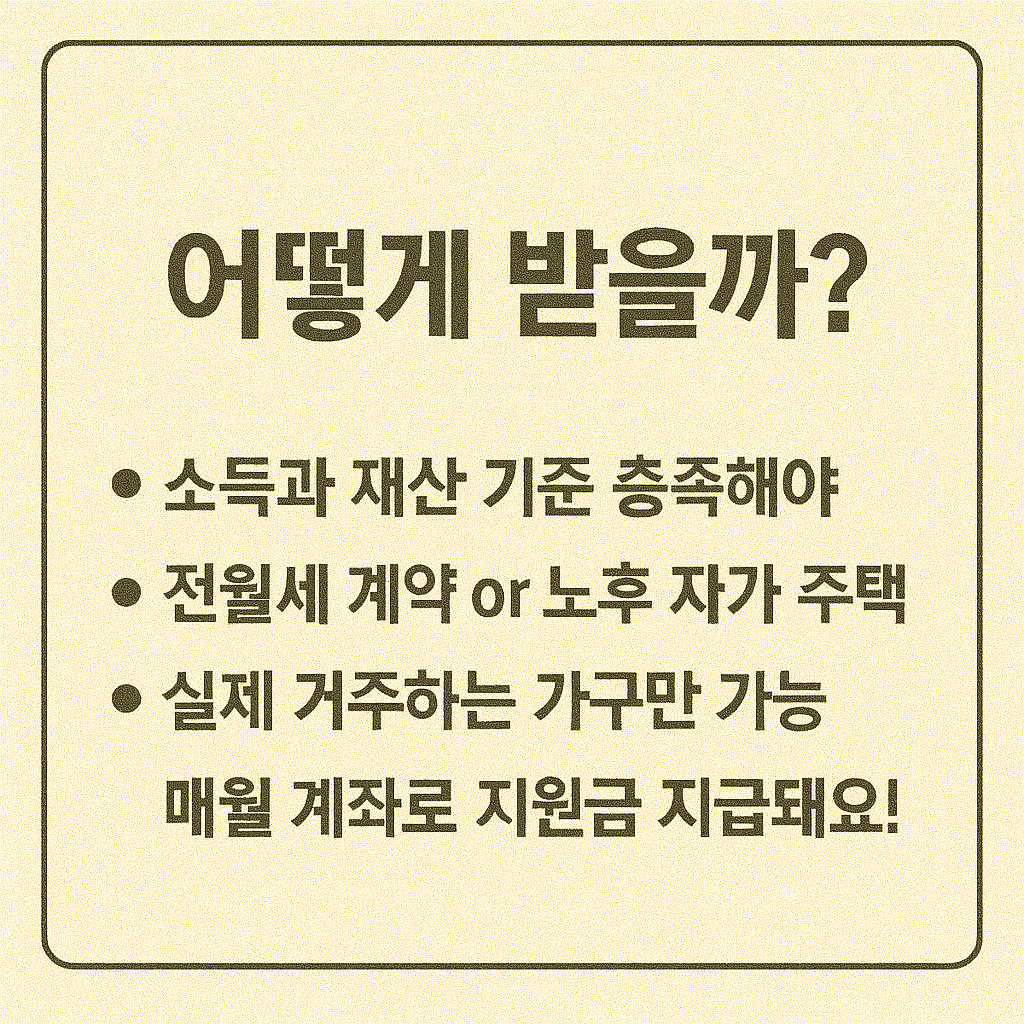 | 임차가구 | 중위소득 48% 이하 + 임대차계약 체결 + 실거주 | 월 임차료 직접 지급 (기준임대료 한도) |