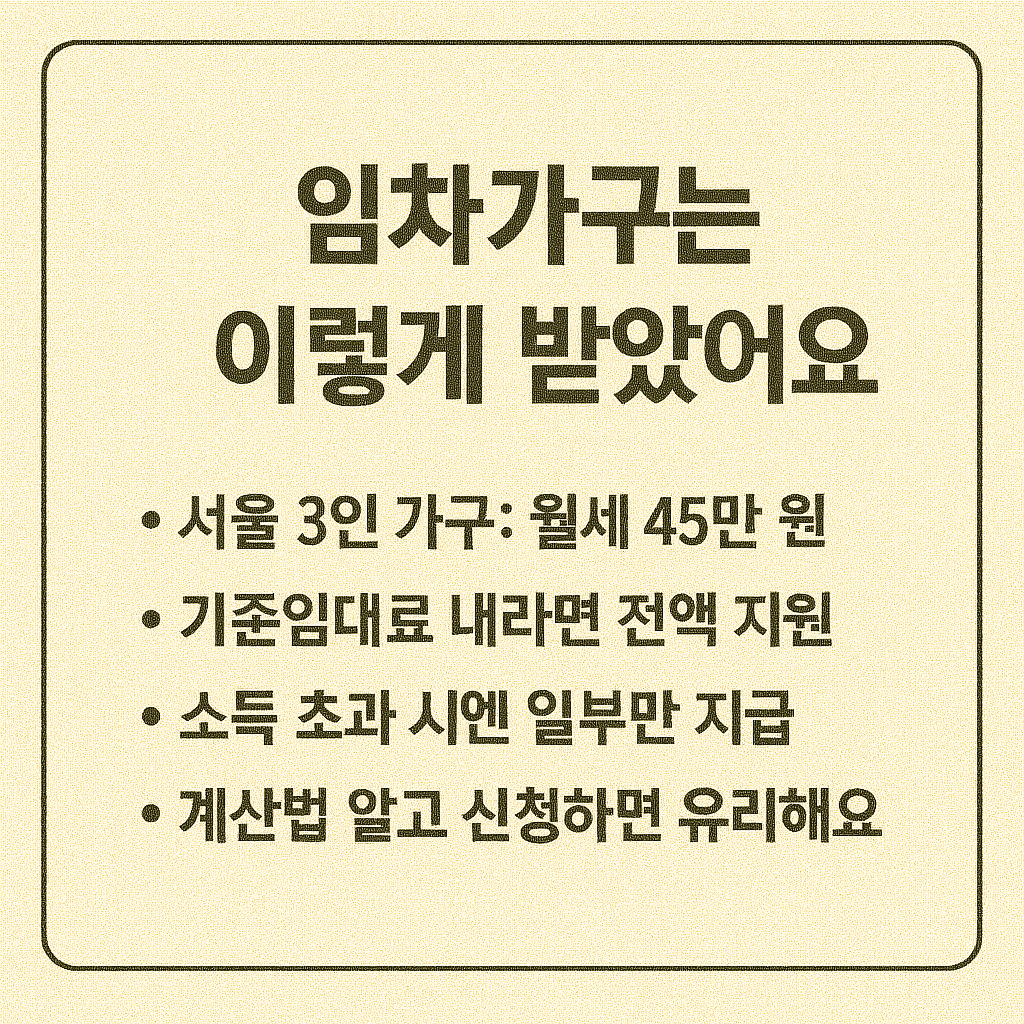 | 임차가구 | (기준 또는 실제 임차료 – 자기부담금) | 서울 3인: 470k – 0 = 450k | 450,000원 |