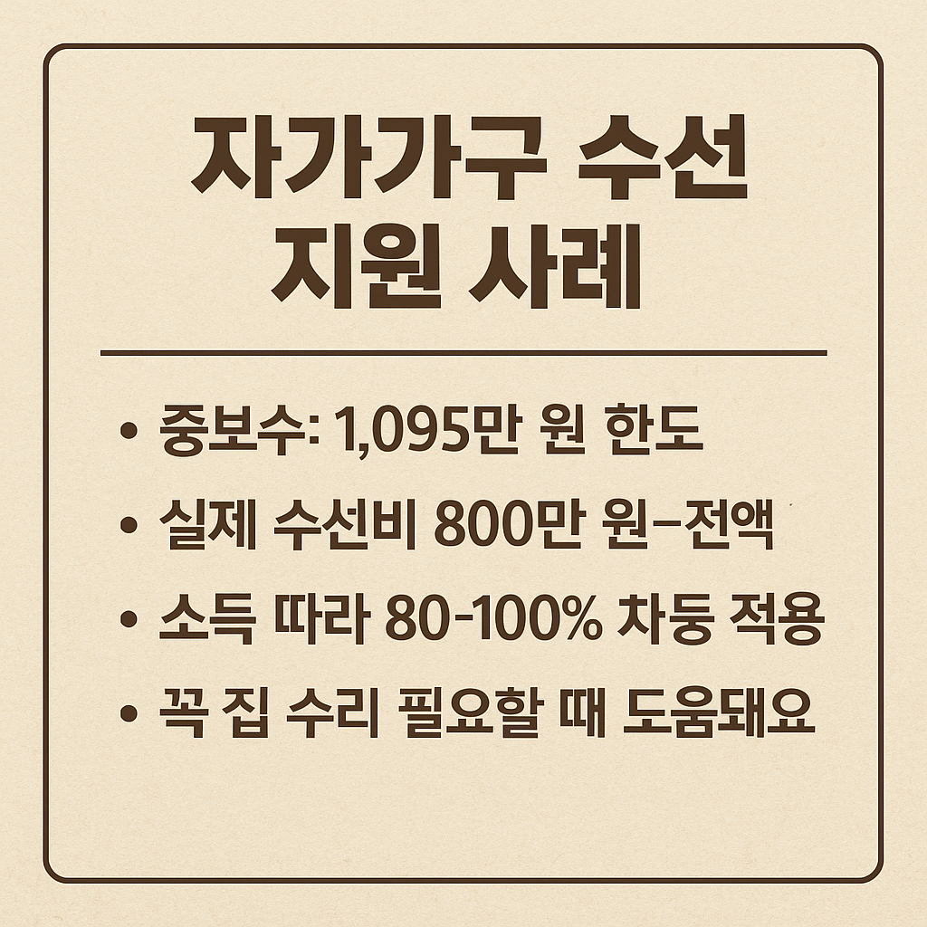 | 자가가구 | 실제 수선비용 상한선 이하 전액 | 중보수 1,095만 한도내 800만 | 8,000,000원 |