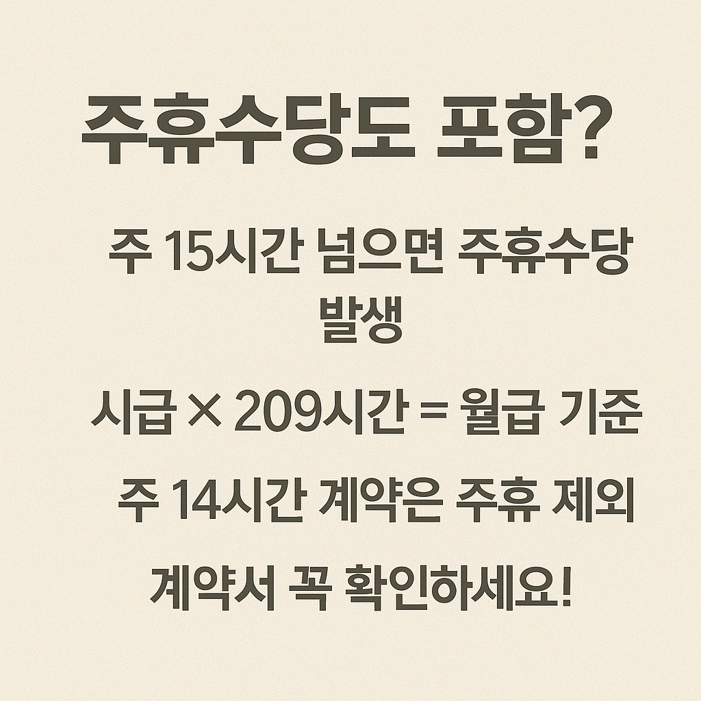하지만 이 계산에는 주휴수당이 포함되지 않았으며, 법적 기준으로 월 고정급을 산출할 때는 “209시간”이라는 기준이 사용됩니다.