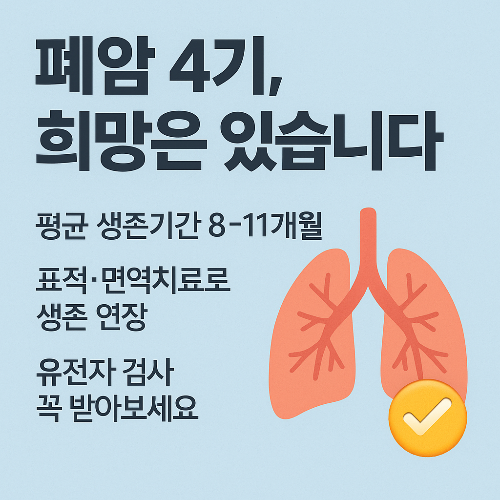 폐암 4기 생존기간은 환자의 유전자 상태, 치료 선택, 초기 대응 속도에 따라 매우 다양합니다. 최신 치료법이 빠르게 발전하는 만큼, 진단 초기부터 다학제 협진과 유전자 검사를 통해 환자 맞춤 전략을 수립하는 것이 장기 생존의 열쇠입니다.