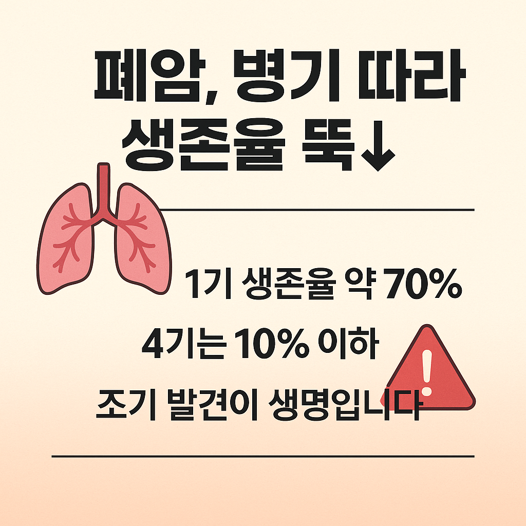 폐암은 1기에서는 5년 생존율이 70% 이상이지만, 3기에서는 20~30%, 4기로 넘어가면 5~10% 수준으로 급격히 낮아집니다. 이처럼 폐암 생존율은 진단 시점에 따라 극명한 차이를 보이며, 초기 진단 여부가 곧 생존 가능성을 결정짓는다는 사실을 보여줍니다.