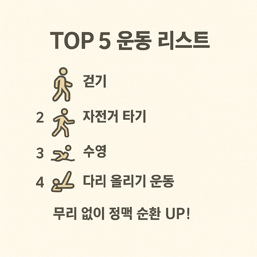 | 걷기 운동 | 일상생활에서 가장 간단하게 실천할 수 있는 유산소 운동 | 종아리 근육 수축 → 정맥 펌프 기능 촉진 → 혈액 역류 방지 |