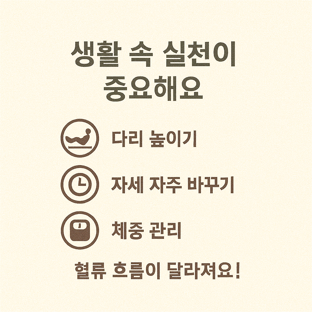 | 장시간 같은 자세 피하기 | 1시간 이상 앉거나 서 있을 경우 틈틈이 스트레칭이나 자세 변경 | 혈액 순환 촉진, 정맥 압력 분산 |