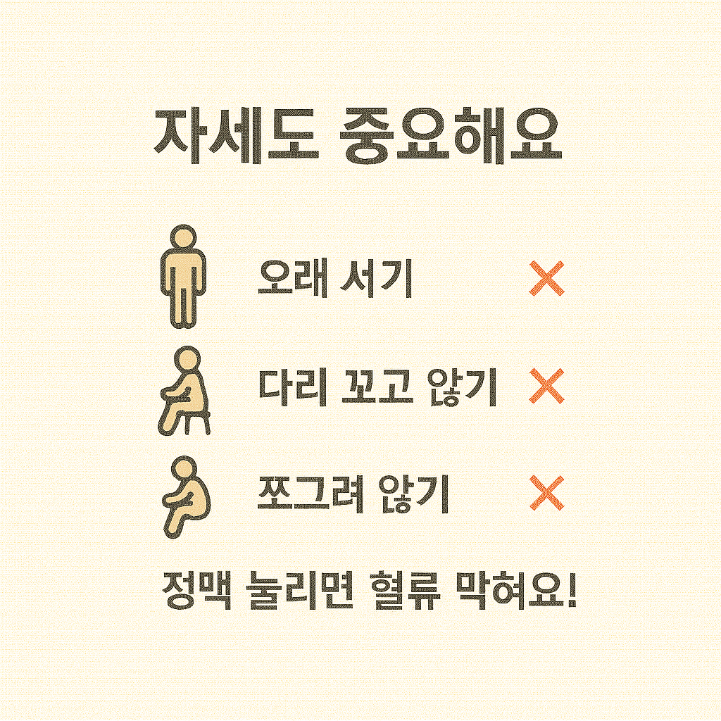 - 다리 꼬지 않기: 앉은 자세에서 다리를 꼬면 정맥이 눌려 혈류 장애 유발