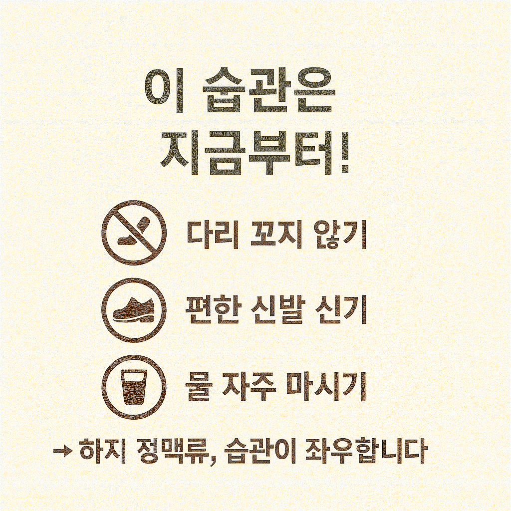 하지 정맥류는 단지 운동만으로 완전히 예방되거나 치료되는 질환은 아닙니다. 일상에서의 잘못된 습관들이 정맥 압력을 높이고 증상을 악화시킬 수 있기 때문에, 생활 전반에서 혈류 순환을 도와주는 습관을 꾸준히 실천해야 합니다. 특히 이미 하지 정맥류가 있는 경우에는 작은 습관 하나가 통증 완화나 진행 억제에 큰 차이를 만들 수 있습니다.