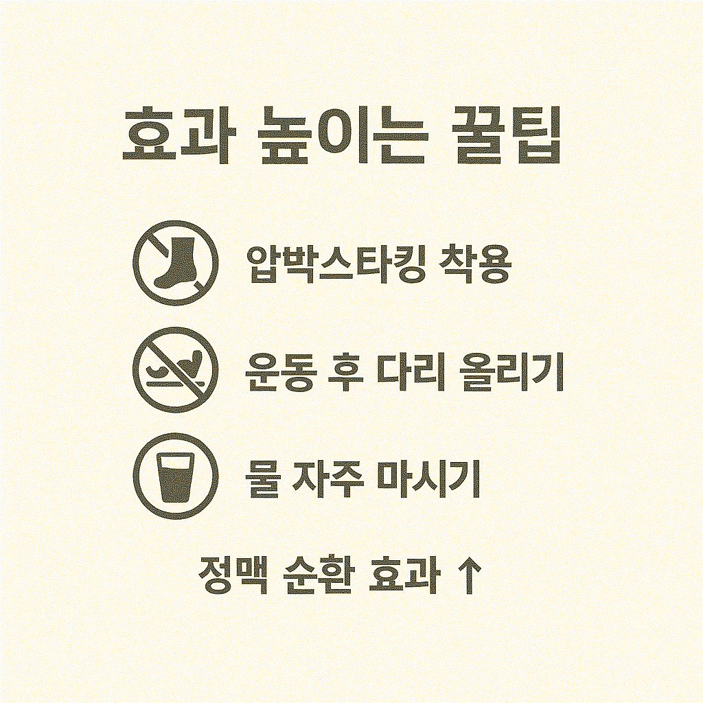 | 유산소 운동과 스트레칭 병행 | 걷기+종아리 들어올리기+다리 올리기 등 혼합 운동 구성 | 정맥 밸브 기능 강화, 운동 효과 상승 |