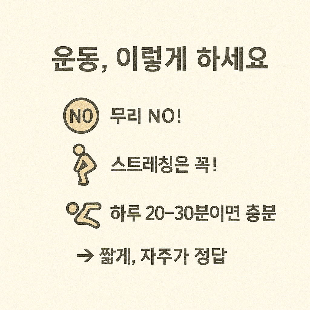 - 무리한 웨이트 운동이나 장시간 고정 자세 피하기