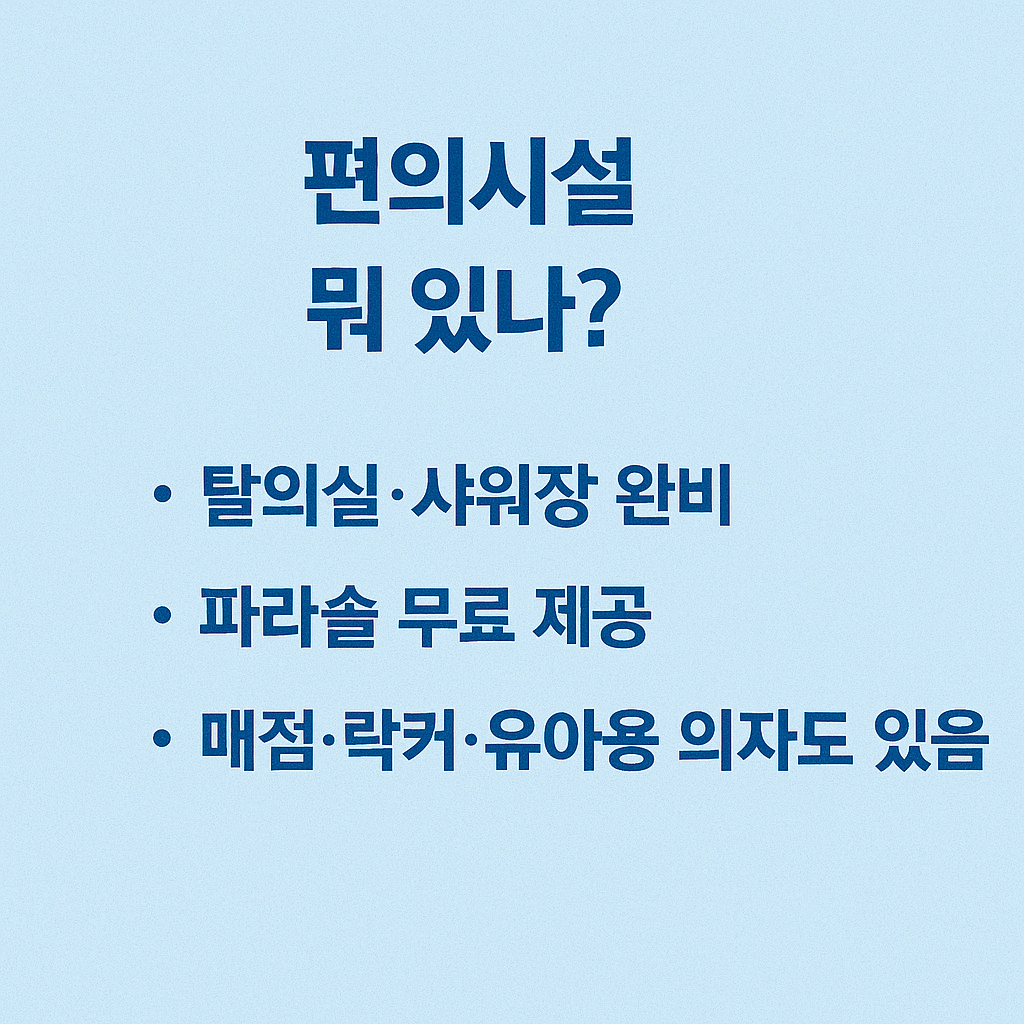 - 탈의실 및 샤워장: 남녀 분리 공간, 온수 샤워 가능, 샴푸/비누는 비치되지 않음