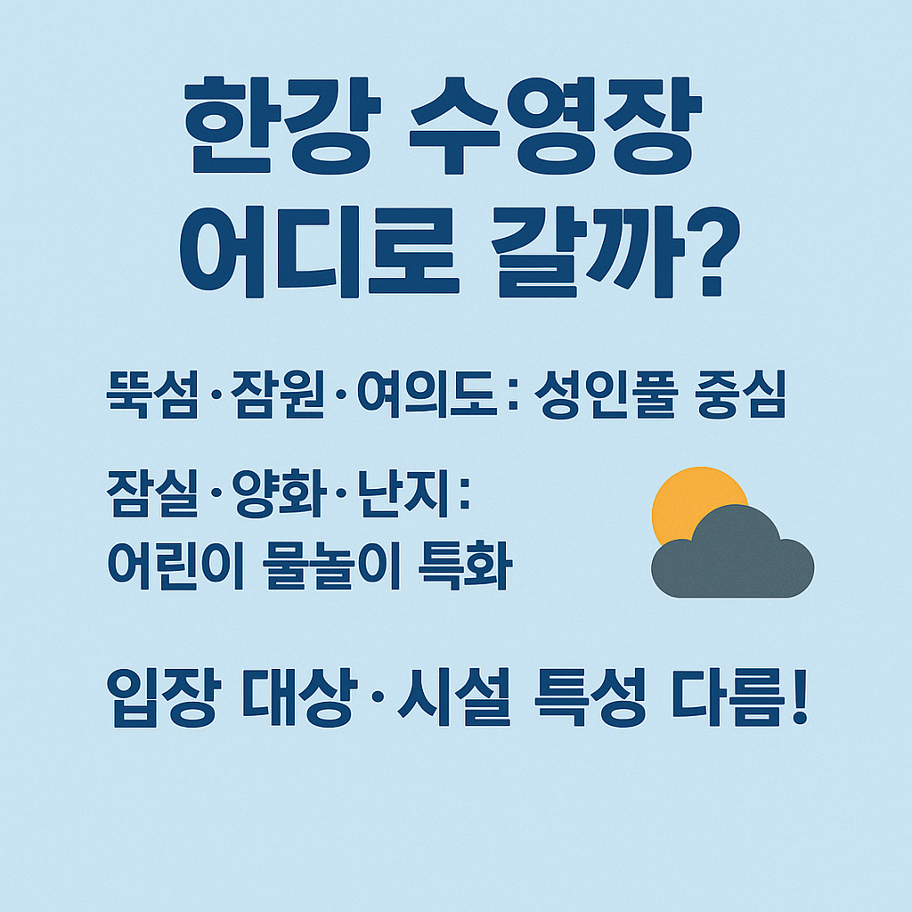 2025년 한강 수영장은 총 6곳(수영장 3곳, 물놀이장 3곳)에서 운영됩니다. 이용 목적에 따라 성인 풀, 유아 풀, 자연형 놀이터 등으로 구분되어 있으며, 각 장소별 특징이 달라 방문 전 미리 알아두면 편리합니다.