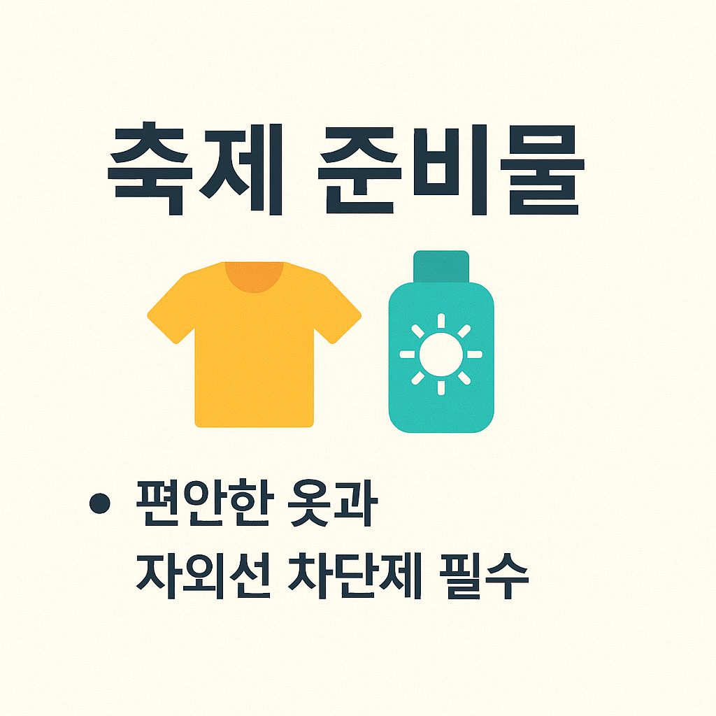 야외 행사 특성상 벌레 물림, 피부 자극, 두통, 소화 불량 등에 대비해 간단한 구급약과 소독약, 밴드, 진통제 등을 준비하는 것이 좋습니다. 손 소독제, 물티슈, 휴지 등 개인위생 용품도 챙기면 쾌적하게 축제를 즐길 수 있습니다. - 어린이 동반 시 추가 준비
