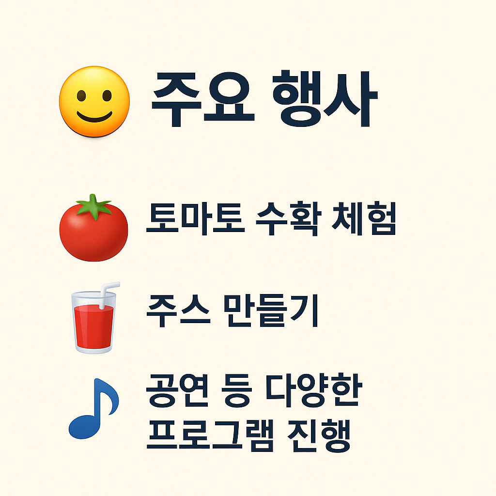 | 토마토 수확 체험 | 직접 토마토를 따고 수확하는 체험 활동 | 전 연령 | 축제 기간 내 상시 |