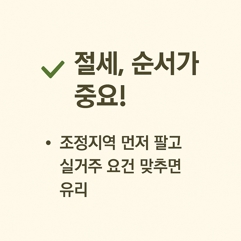 - 비조정지역 또는 장기보유 주택을 먼저 매도하면 장기보유특별공제 등 절세 혜택을 최대로 받고, 다음 주택 매도 부담을 줄일 수 있습니다.