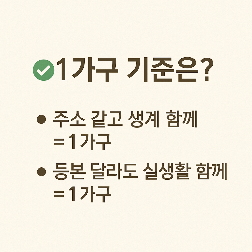 - 별도의 세대 구성이라도 실제 생활·경제공동체임이 인정되면 하나의 가구로 판단됩니다.