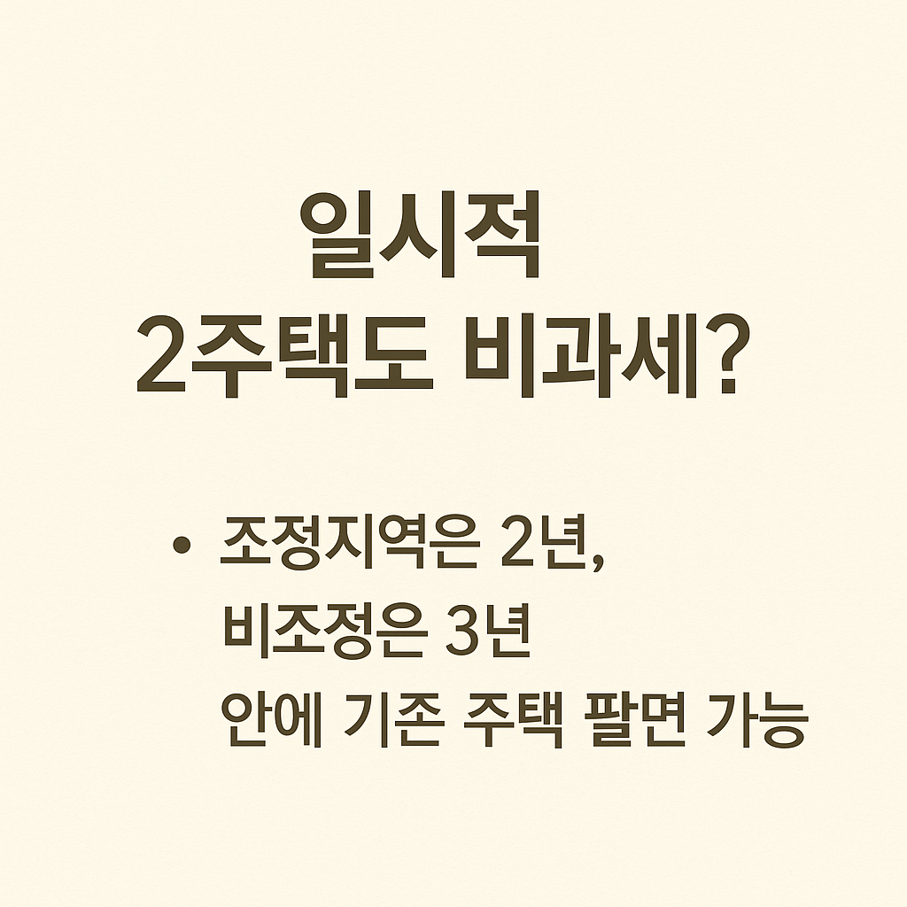 - 비조정지역에서 신규 주택 취득 후 기존 주택을 2년 내에 양도하면 일시적 2 주택 요건 충족