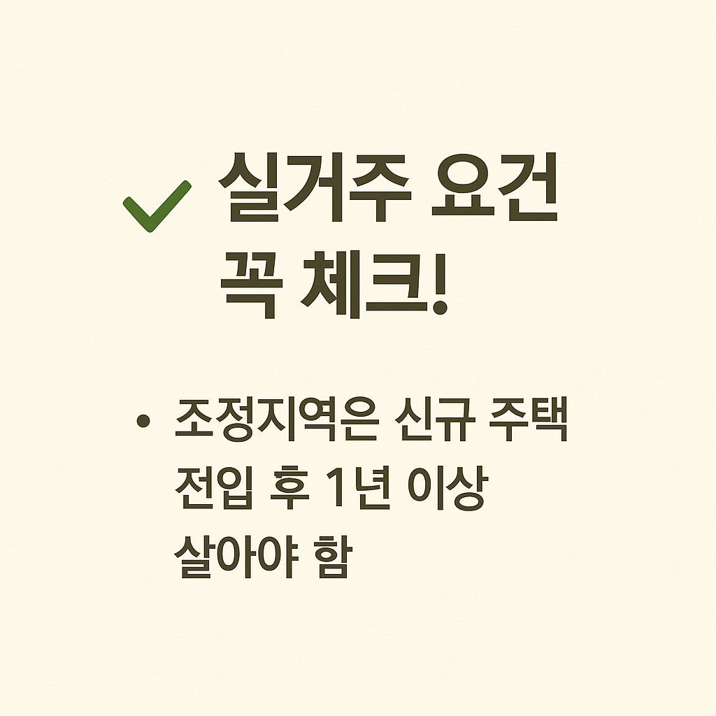 - 전입신고와 실거주 기간 확보(조정지역은 1년, 비조정지역 권장 2년 이상)