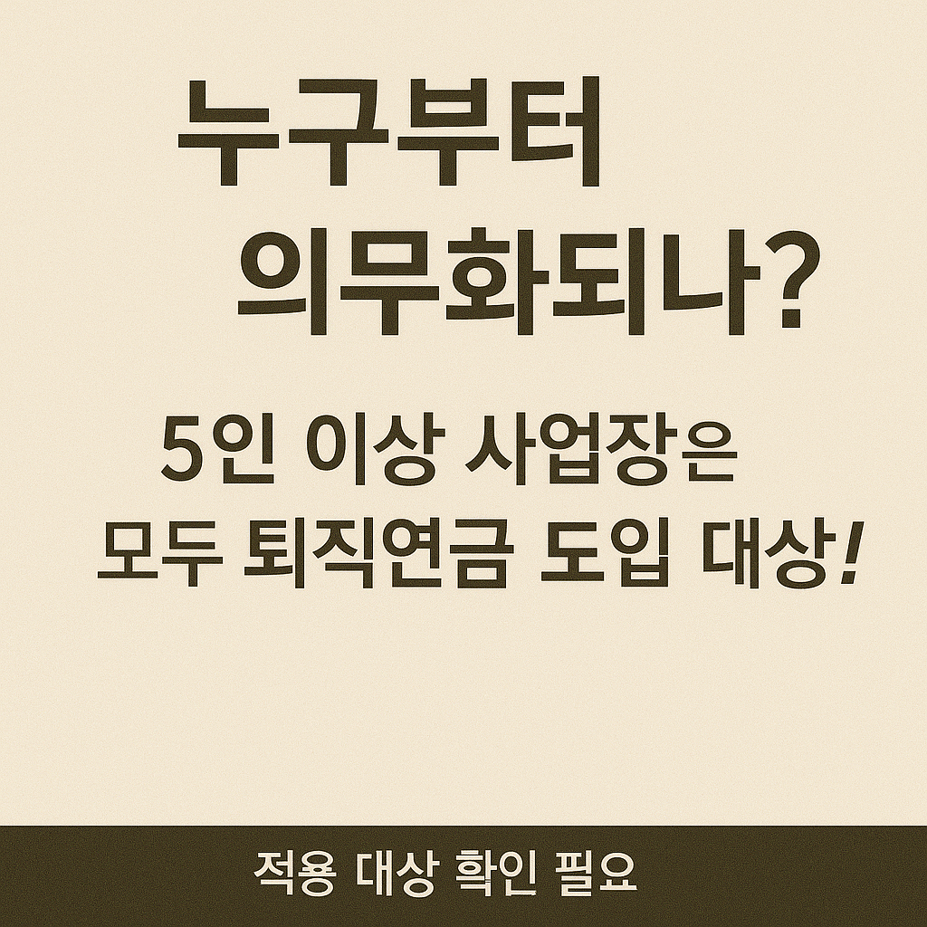 퇴직연금 의무화는 사업장 규모와 고용형태에 따라 적용 여부가 달라집니다. 전체 사업장이 일괄적으로 동일한 기준으로 적용받는 것이 아니라, 점진적 확대와 일부 예외 조항이 존재합니다. 이에 따라 자신이 운영하는 사업장이 의무화 대상인지, 예외 적용을 받을 수 있는지 명확하게 판단하는 것이 제도 대응의 핵심입니다.
