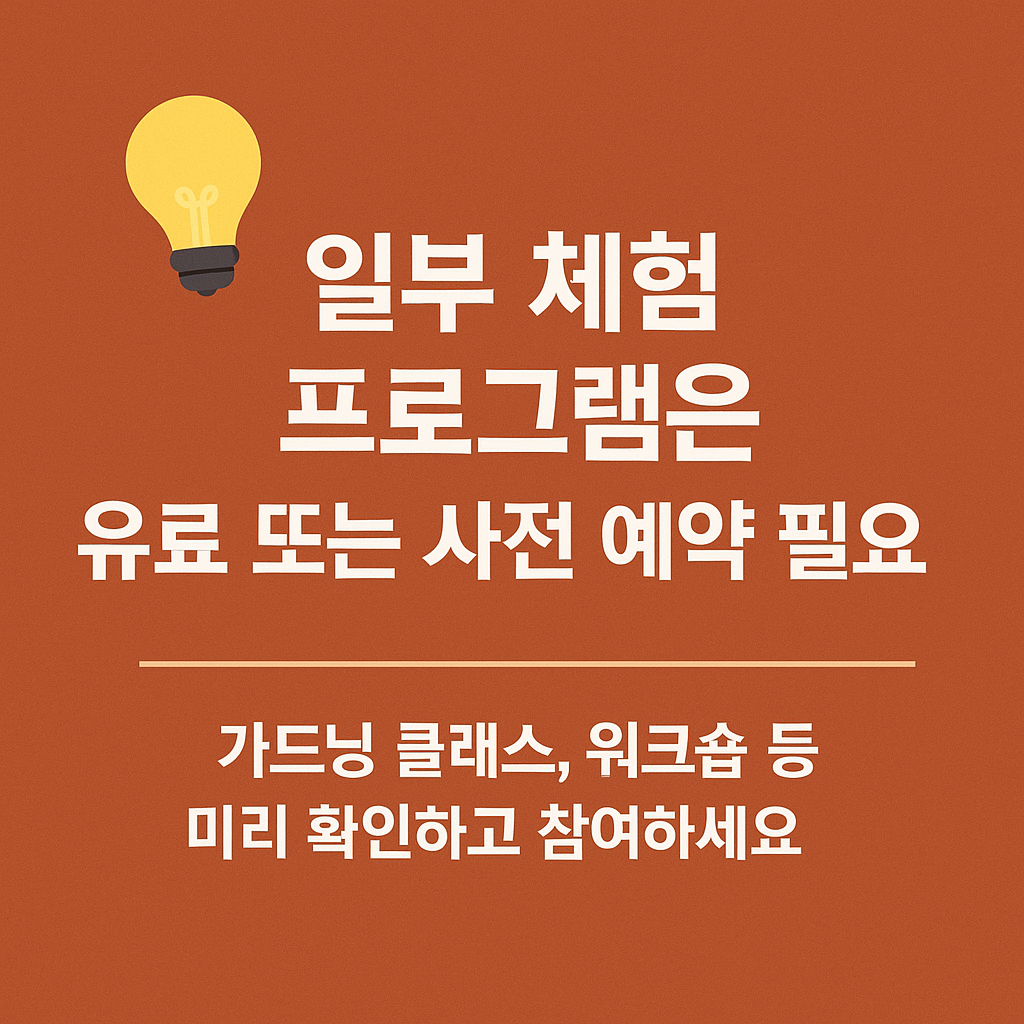 정원 전시뿐 아니라 다양한 체험 프로그램도 마련되어 있습니다. 대부분은 무료이며 일부는 사전 신청 또는 유료로 운영됩니다. 행사 기간 내내 가족 단위, 어린이, 성인 대상 맞춤형 체험이 연속적으로 열리므로, 공식 홈페이지의 주간 프로그램 일정을 확인하면 더욱 유익한 관람이 가능합니다.