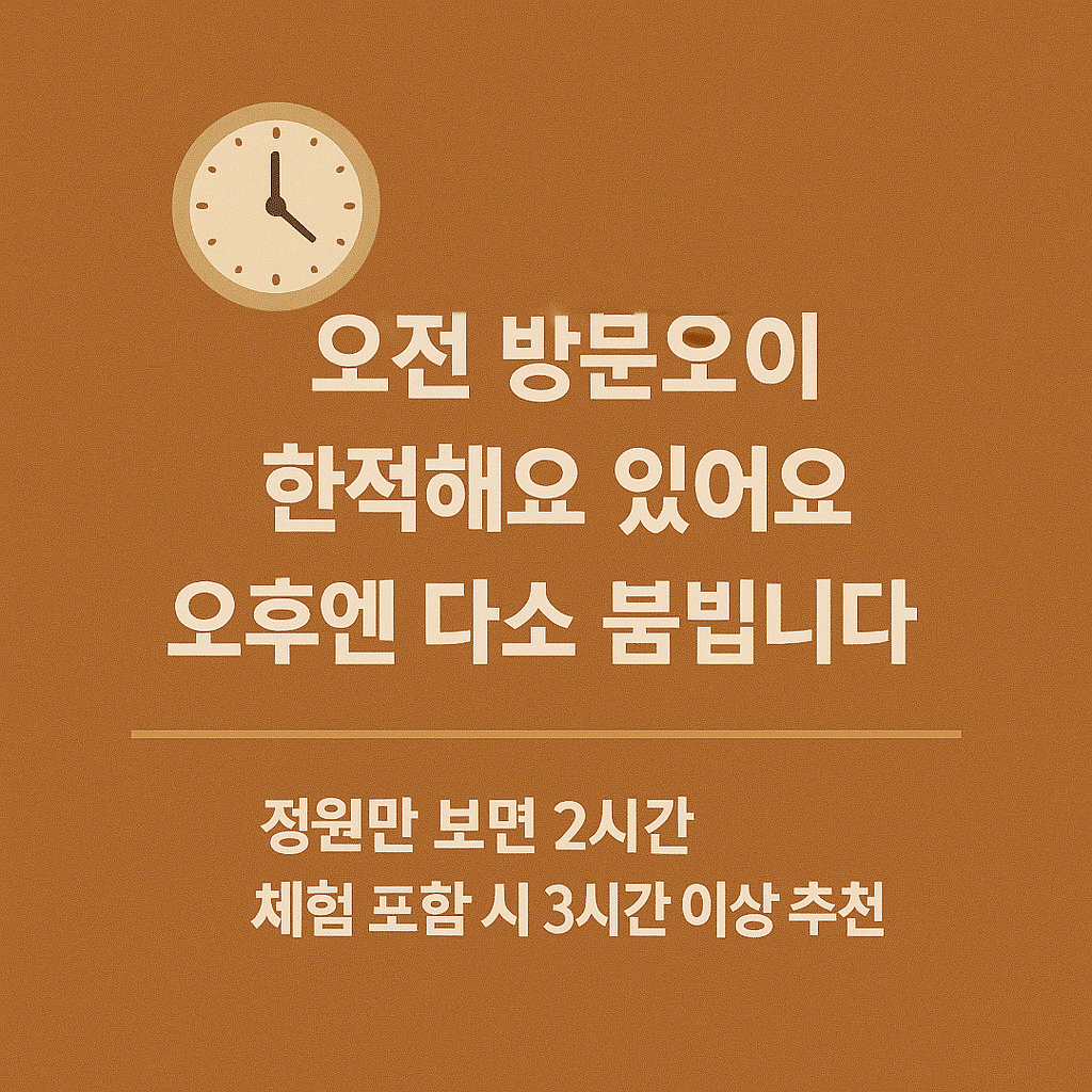 - 기준 관람 소요 시간: 단순 정원 관람은 1.5~2시간, 체험 포함 시 3시간 이상