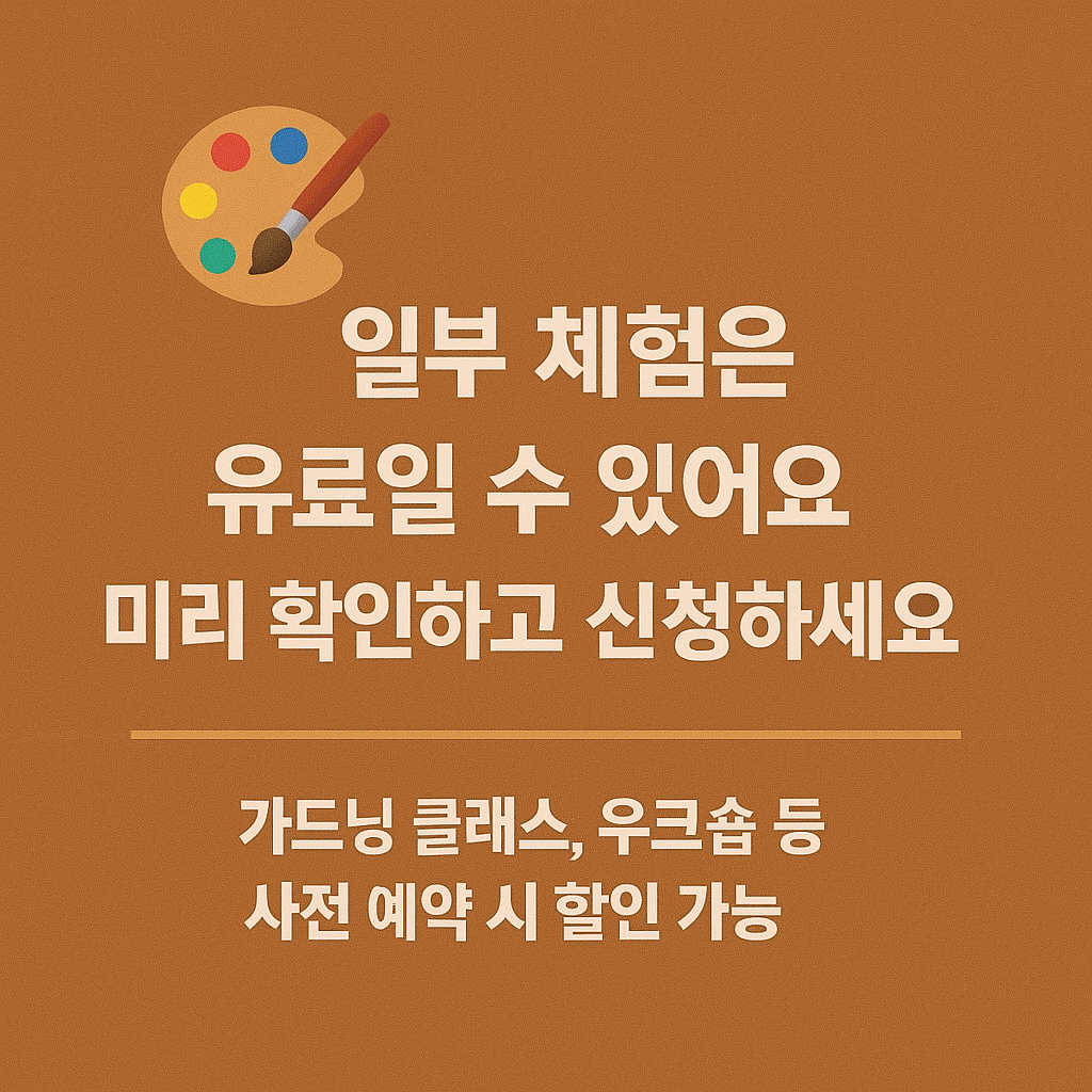 일반적인 체험 부스 중에는 ‘원예 클래스’, ‘DIY 가드닝 키트 만들기’, ‘소형 화분 페인팅’ 등 시민 참여형 교육 프로그램이 있으며, 이 중 일부는 유료로 운영됩니다. 보통 1인당 3,000원에서 10,000원 정도의 참가비가 발생할 수 있으며, 수익은 행사 운영이나 지역 사회 기부로 사용되는 경우가 많습니다. 이때 다음과 같은 대상에게는 우선 신청 기회, 참가비 면제 또는 할인 혜택이 제공될 수 있습니다.